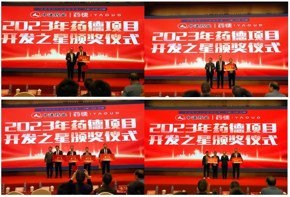 中進市場部部長劉永權宣布《2023年藥德項目開發之星TOP前三名》,盛邀蘇州華瓴科技有限公司發展中心總裁盧恩勝、蘇州華瓴科技有限公司發展中心常務副總裁孟維君、中進人力資源部部長胡耀萍分別為獲得”藥德項目開發之星”第一名、第二名、并列第三名獲獎省區頒獎,現場藥德服務商也為獲獎省區送上特殊禮品,獲獎的優秀省區代表分別作了熱情洋溢的開發經驗分享。